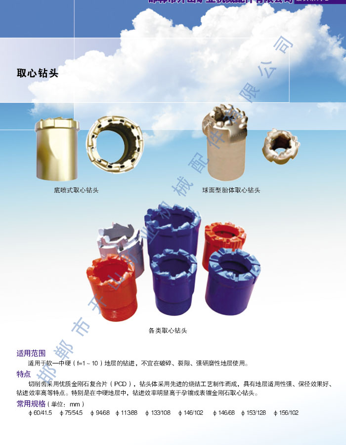 金剛石取心鉆頭是選用高品級(jí)金剛石單晶或天然金剛石顆粒,經(jīng)過(guò)科學(xué)配方和特殊工藝加工而成,具有性能穩(wěn)定 、耐磨性高、適巖性廣的特點(diǎn),適用于f=1-16級(jí)的中硬、堅(jiān)硬、破碎及疊層的強(qiáng)研磨性巖層的鉆進(jìn)。它具備以下優(yōu)點(diǎn): 鉆頭壽命長(zhǎng):以金剛石復(fù)合片為主切削齒,其使用壽命是硬質(zhì)合金的10倍以上,是普通金剛石鉆頭的4~5倍;鉆進(jìn)效率高:金剛石出露量大(復(fù)合多晶層幾乎全部出露),鉆頭能始終保持銳利,因而大大提高進(jìn)尺速度;可低壓、低轉(zhuǎn)速鉆進(jìn):鉆頭以刮擦、剪切來(lái)破碎巖石,其鉆壓只需同徑金剛石孕鑲鉆頭鉆壓1/3左右;保徑效果好:我公司復(fù)合片鉆頭內(nèi)外可鑲嵌金剛石聚晶保徑,耐磨性強(qiáng),保徑性能好,能使切削齒得到高效利用 ;